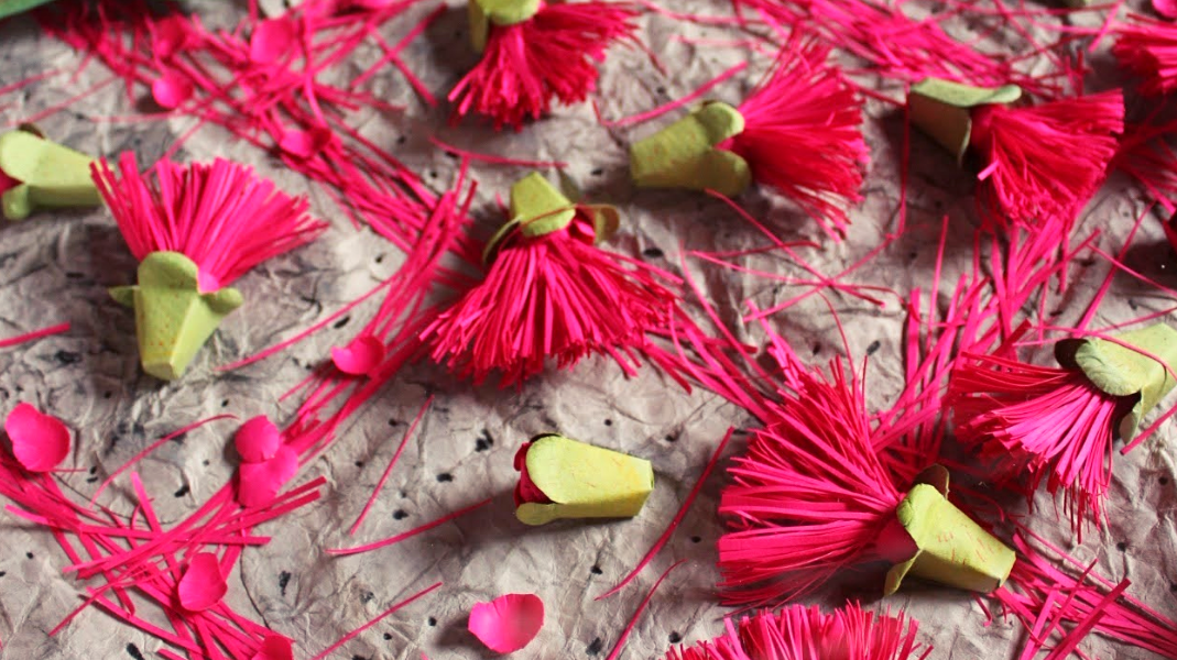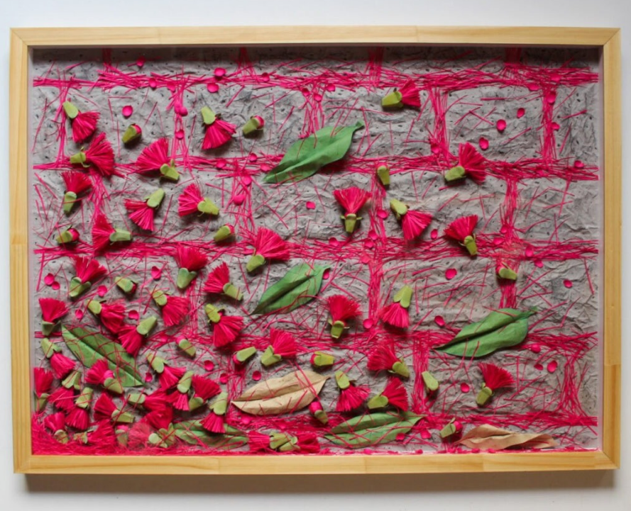 As flores de jambo transformam calçadas em poesia urbana. A obra evoca memórias afetivas — infância, quintais, sabores — enquanto celebra o impacto visual das pétalas que rompem a dureza do concreto. A composição tridimensional mistura cores, texturas e técnicas para recriar o encanto desse instante efêmero.